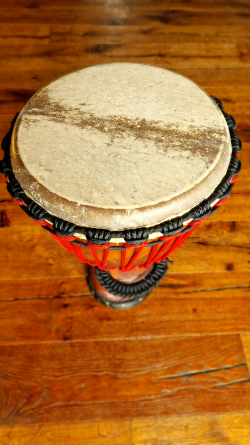 Djembe má krásný tvar a je ručně vyráběno na Slovensku z jednoho kusu středně tvrdého mahagonového dřeva. Má krásný zvuk a velké rozdíly mezi jednotlivými tóny: slap, bass, tón.